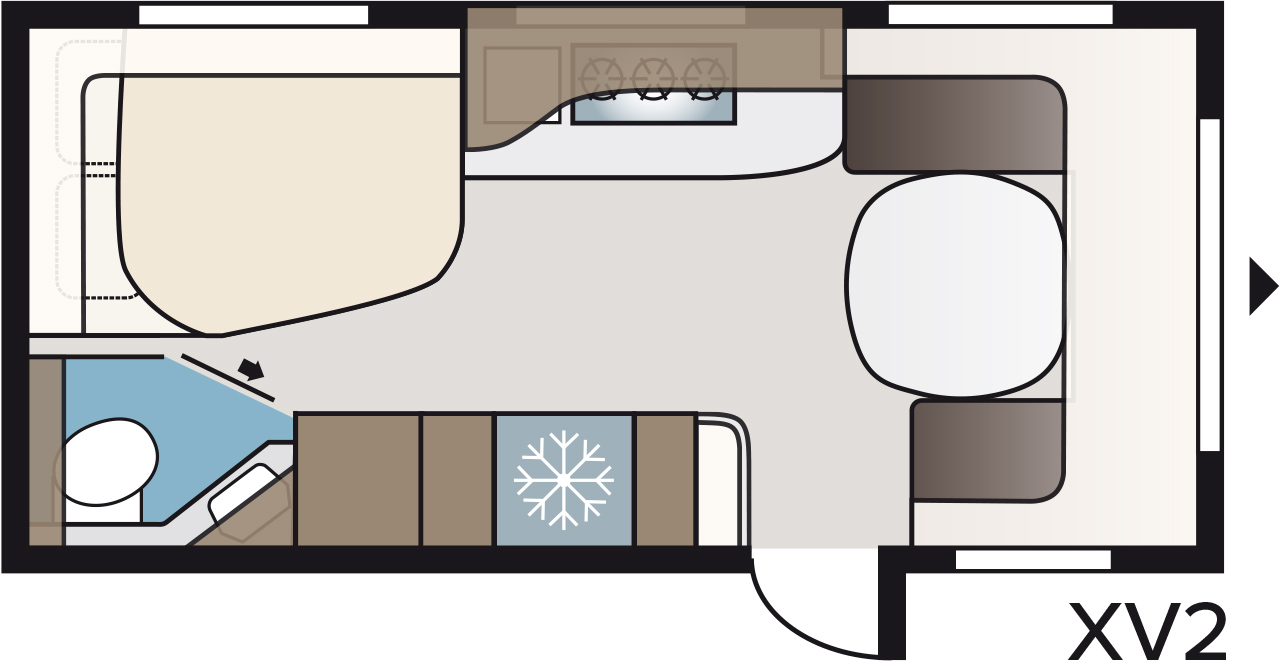 En planlösning med dubbelsäng och en rundsittgrupp som kan bäddas ner. Den har även ett stort kök, stort kylskåp med separat frys, en trelågig gasolspis och en kassettoa. Värmesystemet är Alde vattenburen centralvärme med golvvärme.